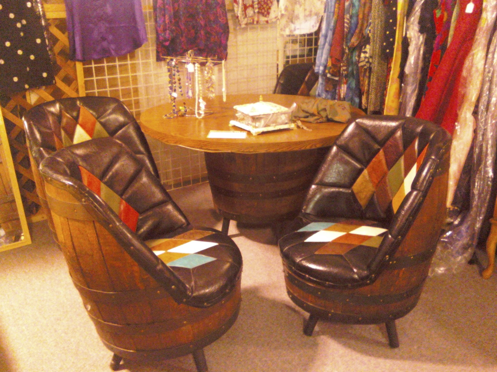 On one of these meanderings, I turned a corner to find a table and chairs set made from barrels. The table top was round and sat on top of a barrel. Its chairs were cut from barrels and were covered with a patchwork of multicolored leather.