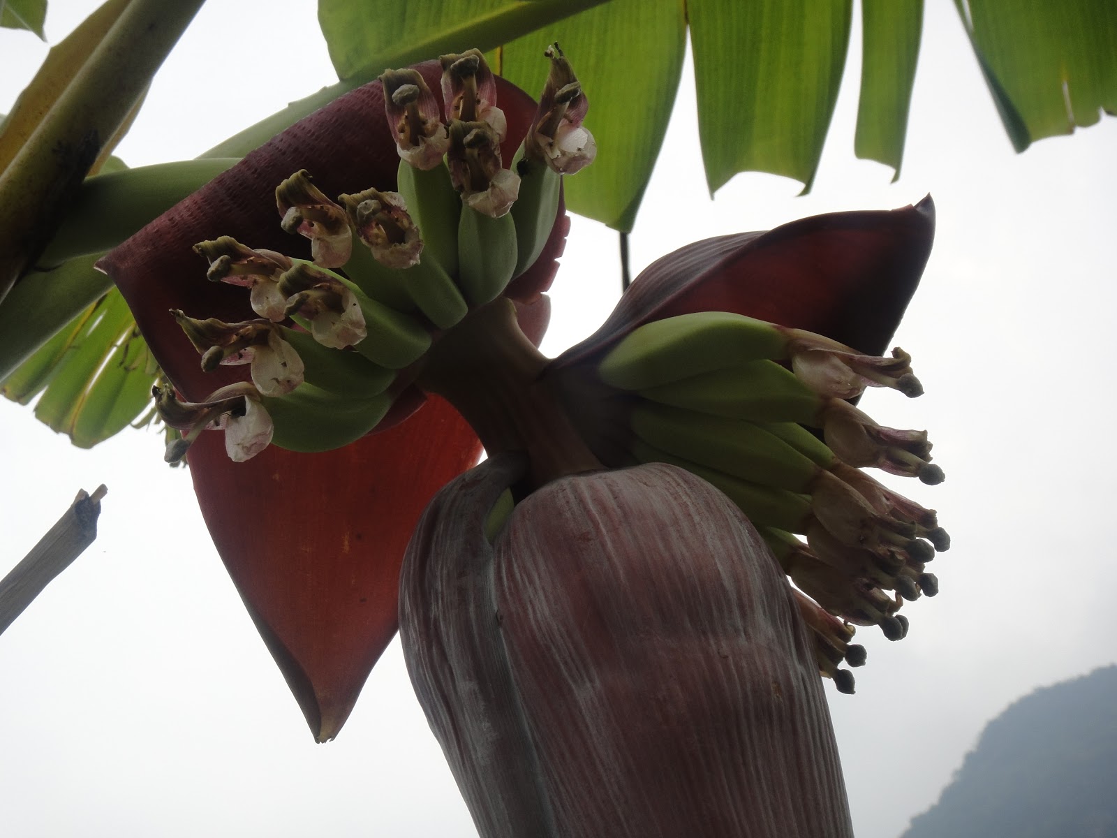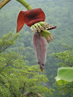 There is a huge flower that grows on a banana tree. As each layer of the flower pulls back, there is a bunch of bananas growing beneath it. At the tip of each banana is yet another flowering bloom. I was so enthralled by this scene from nature.