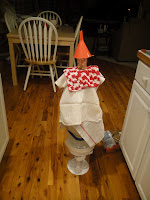 Of course I must mention the furniture on top of the doll house (that was to keep the items safe from the tornado). Or the people of her doll house family hanging from the rails of the porch.