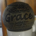 I have to say that I did find one item to use in my home that held the word grace. It is a small ball and it says, “Grace. ‘Being justified freely by His grace through the redemption that is in Christ Jesus.’ Romans 3:24”